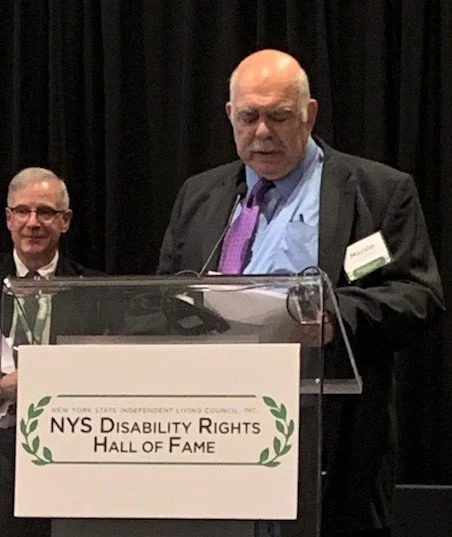 In Image No. 2, Marvin Wasserman accepting induction into the NYS Disability Rights Hall of Fame on behalf of the late Sandra Schnur. On the left is Brad Williams, E.D. of New York State Independent Living Council (NYSILC), which oversees the Hall of Fame. Photo by Rita Seiden.